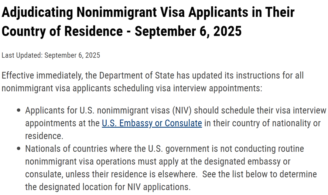 美国国务院9月6日突然在官网发布公告,宣布即日起,美国国务院对所有非移民签证(NIV)申请者预约面谈的规定作出更新: