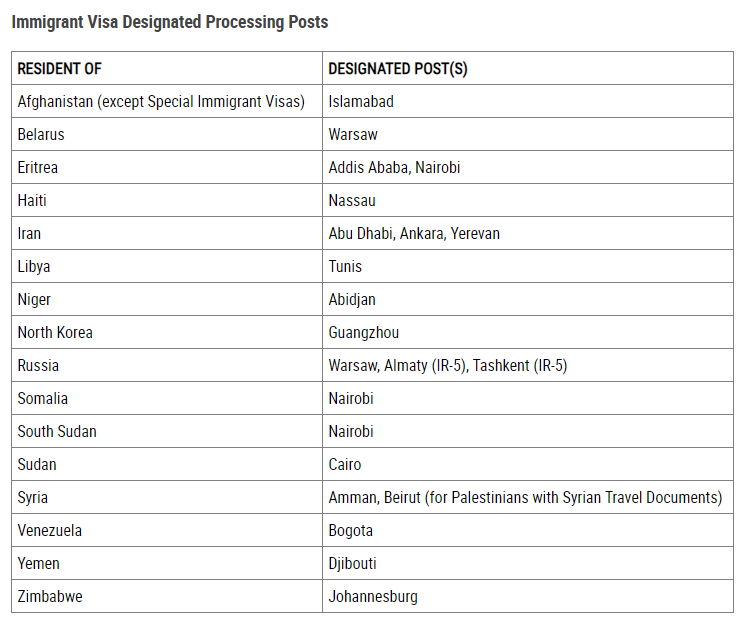 对于一些美国未提供常规非移民签证服务的国家,国务院指定了替代面谈地点: