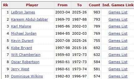 至此,布克生涯已350次砍下25+,排名NBA历史第40位。榜单前10如下:
