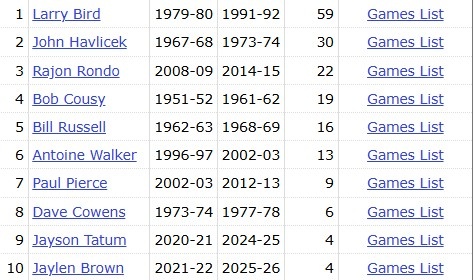 据统计,这是布朗生涯第5次斩获三双,超塔图姆,升至队史第9位。