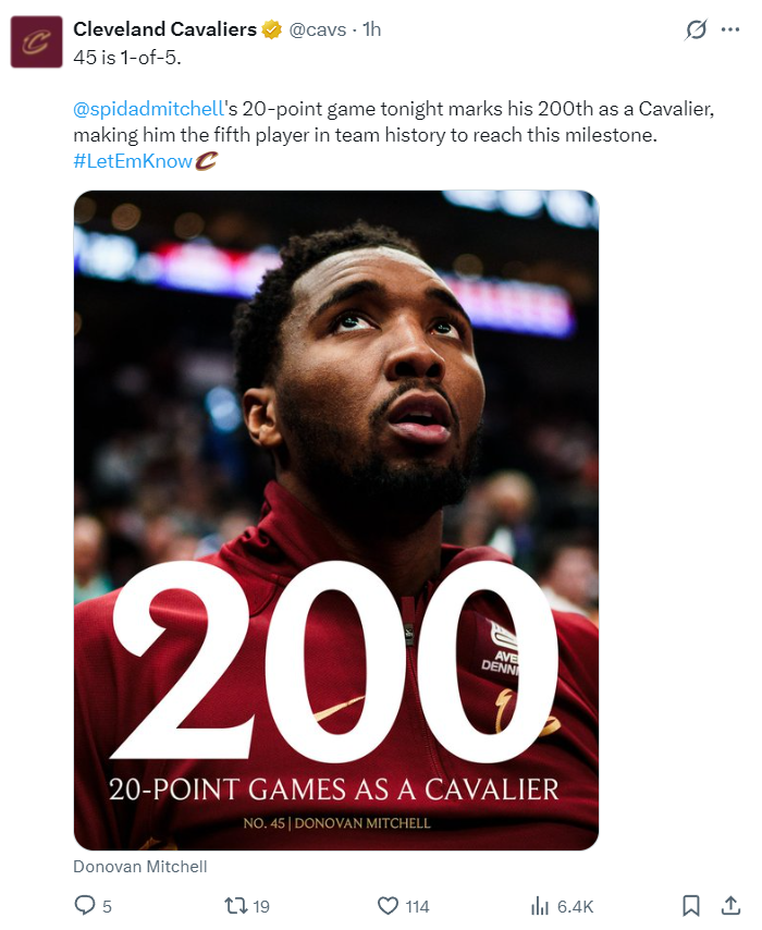 骑士官方写道:米切尔在骑士生涯完成第200场20+排在队史第五位,米切尔又迎来一项里程碑,他还用自己在关键时刻的能力带队取胜。