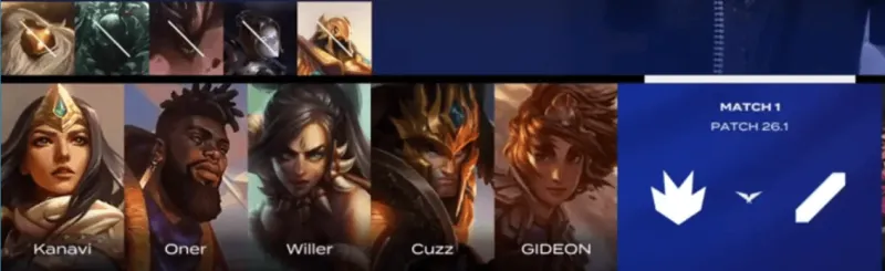 打野队选用:GIDEON奎桑提、Cuzz皇子、Willer岩雀、Oner希维尔、Kanavi豹女